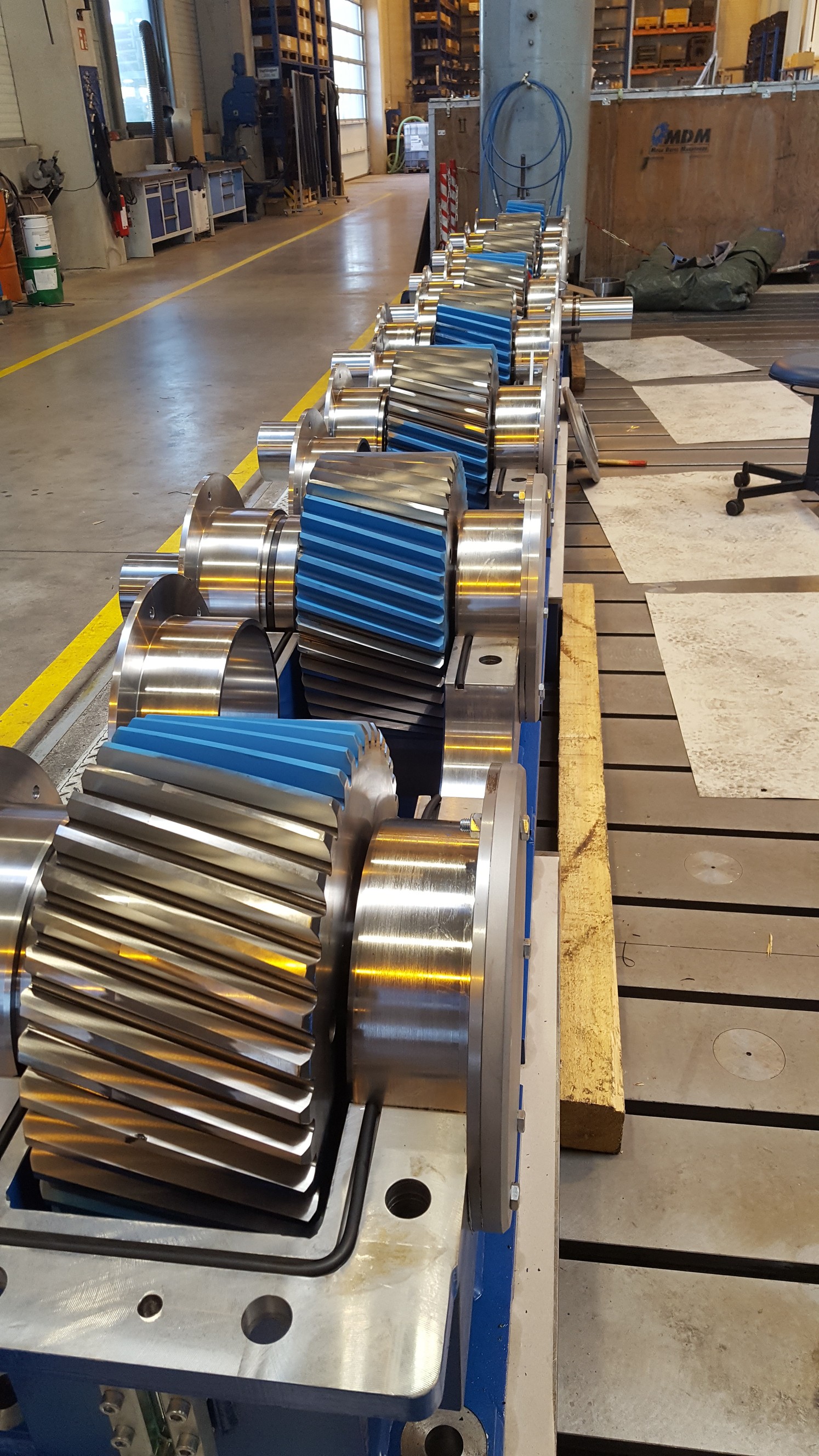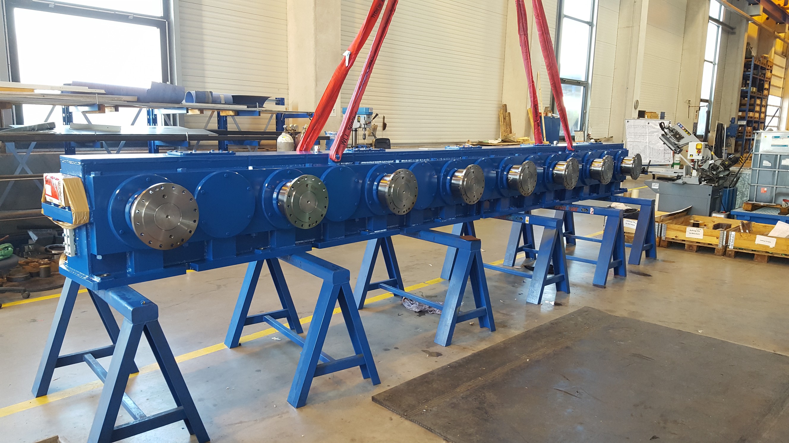 Am 12.10.2018 konnten wir planmäßig ein Rollenganggetriebe für einen deutschen Kunden in der Stahlindustrie fertigstellen. Das Getriebe wurde inkl. der Kupplungen von uns nach Kundenzeichnungen gefertigt. Es gehört mit ca. 12000 kg Gewicht nicht zu den schwersten, aber mit einer Gesamtlänge von 6900 mm und 15 Wellen zu einem der längsten Getriebe, die wir bisher fertigen durften.