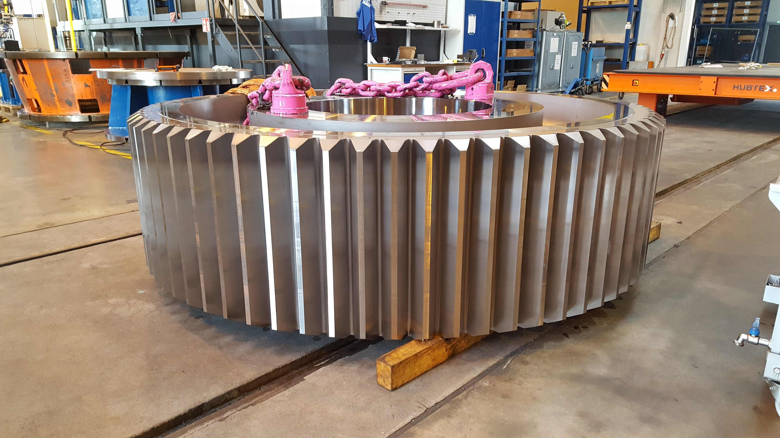 В октябре мы принимали участие в крупном проекте для фирмы из нашей группы компаний (GearTec AG), для которой мы с помощью нашего оборудования обрабатывали зубчатое колесо тихоходного вала морского редуктора. Данной зубчатое колесо из цементированной стали массой около 18 тонн и шириной зуба 720 мм является одним из самых больших колёс, которые мы когда-либо обработали механически. На нашем оборудовании зубчатое колесо после цементации было подвергнуто токарной обработке, фланцы зубьев были отшлифованы-
